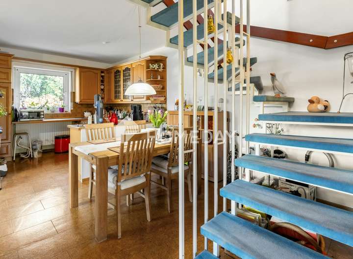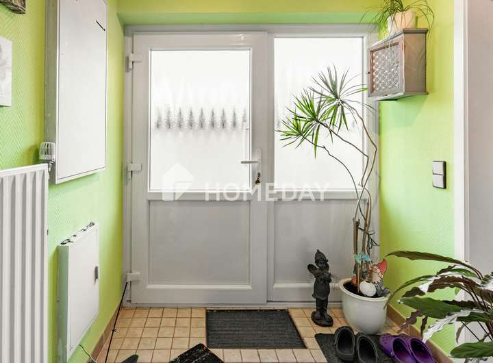Beim Betreten des Hauses wird man sofort von einem einladenden Flur empfangen, der einen ersten Überblick über die gut durchdachte Raumaufteilung bietet. Links befindet sich das Gäste-WC, ausgestattet mit einem Fenster für natürliche Belichtung. Geradeaus gelangen Sie in die Küche mit Essbereich, die durch ihr großes Fenster viel Tageslicht bietet und viel Platz für gemeinsame Mahlzeiten und gesellige Stunden schafft. Direkt an den Essbereich grenzt ein praktisches Büro oder Spielzimmer für Kinder.
