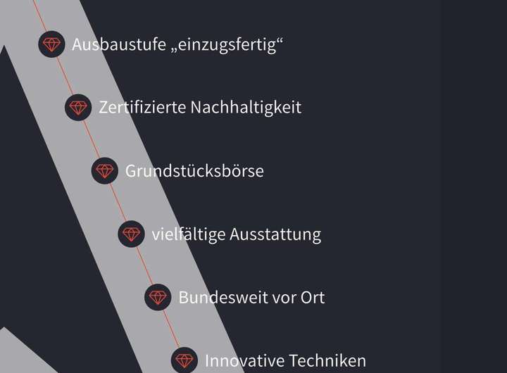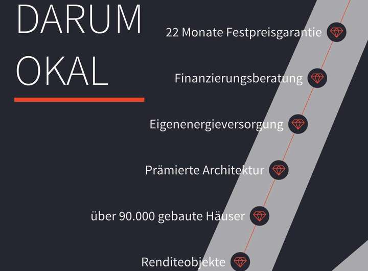 + Architektenleistung: Planung, Bauantrag, Vermessungsleistung, Entwässerungsplanung und vieles mehr Gemeinsam mit unseren hochqualifizierten Architekten planen Sie als künftige Eigenheimbesitzer Ihr neues Zuhause Stück für Stück + Grundrissänderungen oder Haustypenänderungen viele individuelle Änderungen sind für Sie kostenneutral + Bodengutachten: Absolute Sicherheit über die Bodenbeschaffenheit Ihres Grundstücks gibt Ihnen das im Festpreis enthaltene Bodengutachten + Bodenplatte/Keller: Massiver Stahlbeton bildet das stabile Fundament für Ihr neues Heim. Optional auch mit Nutz- oder Wohnkeller! + 2,80 m Raumhöhe: Mehr Raum zum Leben! Wir bieten Ihnen eine Raumhöhe der ganz besonderen Art + hochwertige Aluminiumrollläden ausgeschäumte Aluminiumrollläden im ganzen Haus an allen Fenstern und Terrassentüren mit elektrischer Steuerung im Hauspreis standardmäßig + Zertifizierte Nachhaltigkeit: OKAL Häuser erhalten serienmäßig das Nachhaltigkeitszertifikat der DGNB (Deutsche Gesellschaft für nachhaltiges Bauen) in Gold bzw. teilweise auch in Platin, die höchste Stufe + Frischluftwärmetechnik: Heizen war gestern! Die Zukunft heißt OKAL Frischluft Wärmetechnik. Sparsam, ökologisch, effizient und obendrein ein gesundes Raumklima durch geregelte und gereinigte Frischluftzufuhr + Sockeldämmung: Dämmung an den Außenseiten der Bodenplatte einschließlich Verputzung + Ausbaustufen: Sie haben die Wahl aus drei Ausbaustufen, je nachdem ob und wieviel Sie selbst machen wollen. "Einzugsfertig" - "Malervorbereitet" - "Technikfertig" + Kostensicherheit: Festpreisgarantie und verkürzte Bauzeit mit Bauzeitgarantie versprechen kalkulierbare und verlässliche Kosten + Rund um Betreuung: Sehr engagierte und persönliche Betreuung bis zu Ihrem Einzug + vieles mehr Weitere Highlights und Leistungen erfahren Sie im kostenfreien Beratungstermin. Der einfache Weg, direkt anrufen! Claudia Becker 0170 66 20 77 0 claudia.becker@okal.de www.okal.de/claudia-becker