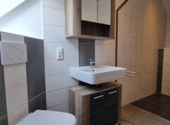 Im Eingangsbereich des Erdgeschosses befindet sich eine Diele mit Badezimmerzugang (inkl. Dusche und Waschmaschinenanschluss). Das Herzstück der Immobilie ist der große Wohn- und Essbereich.
