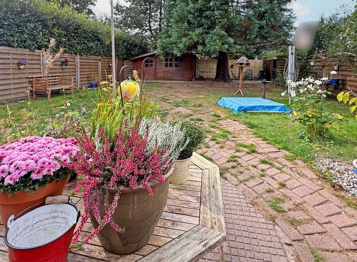 Vom Wohnzimmer gelangen Sie auf die Terrasse und zum Garten, welcher sich in westlicher Ausrichtung befindet. Die Terrassenüberdachung bietet Ihnen einen idealen Schutz für jede Wetterlage. Der Garten bietet Platz für verschiedenste Gestaltungsmöglichkeiten und am Ende des Gartens befindet sich auch noch ein praktisches Gartenhaus (für Gartengeräte, Fahrräder etc.)
