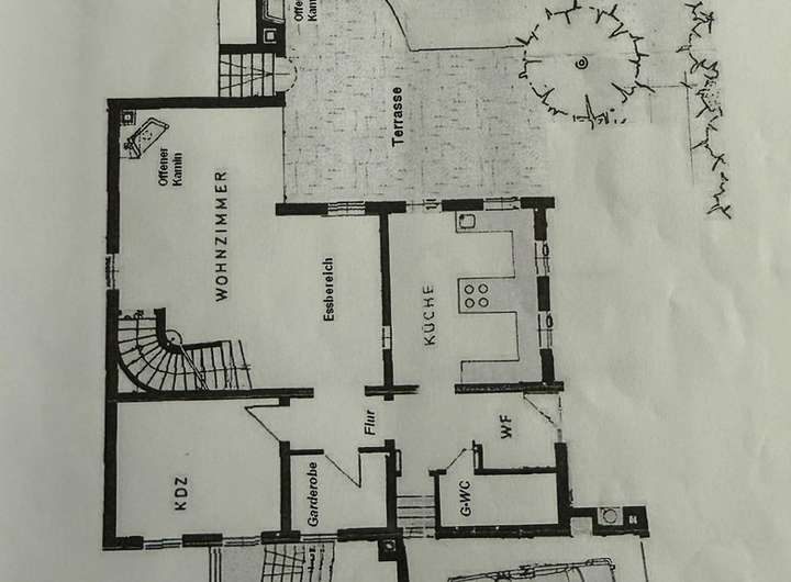 Balkon, Terrasse, Garten, Keller, Vollbad, Einbauküche, Gäste-WC, Kamin, Fliesen