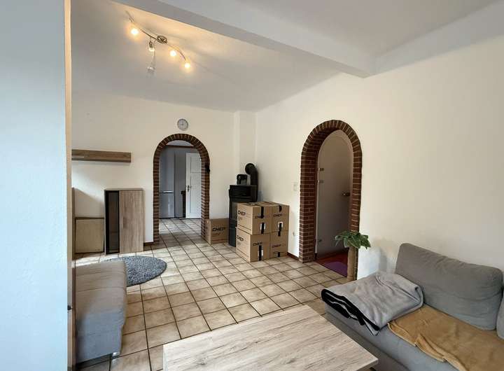 Bereits beim Betreten des Hauses empfängt Sie ein großzügiger Flur. Linker Hand gelangen Sie in das lichtdurchflutete Wohnzimmer, das mit einem gemütlichen Holzofen ausgestattet ist und zum Verweilen einlädt – ideal für entspannte Abende im Kreis der Familie.