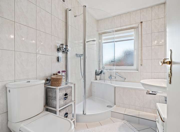 Durch einen abgetrennten Flur betritt man den privaten Bereich. Hier befinden sich zwei helle Schlafzimmer, die sowohl als Rückzugsort als auch flexibel als Kinderzimmer oder Arbeitsbereich genutzt werden können sowie das moderierte Badezimmer, ausgestattet mit Badewanne und Dusche, das zum Entspannen einlädt. Ein praktisches Gäste-WC, das den Wohnkomfort abrundet.
