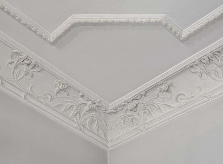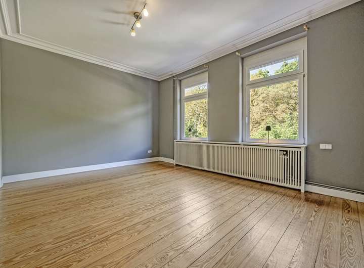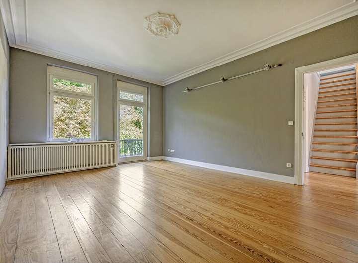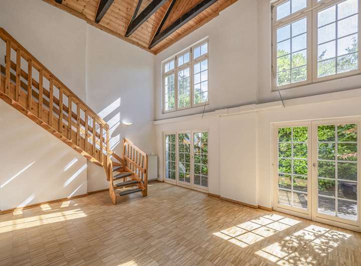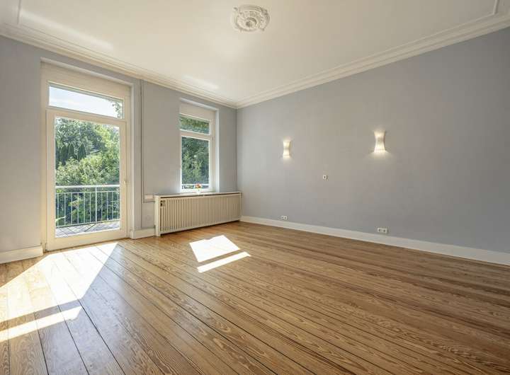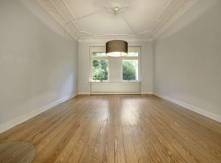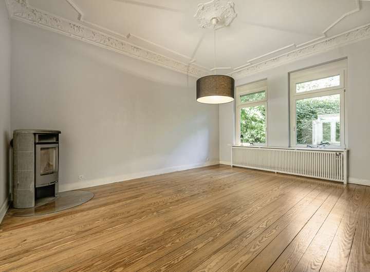 Im Inneren überzeugt die Immobilie durch großzügige und fließende Räume, einen Pitchpine Holzboden und wunderschönen Stuckreliefs im Erdgeschoss.
