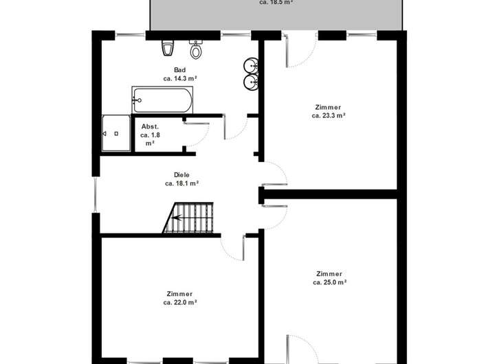 Außergewöhnlich sind die beiden großen Balkone im Obergeschoss in nörd- und südlicher Himmelsrichtung, die zum Verweilen im Freien einladen.