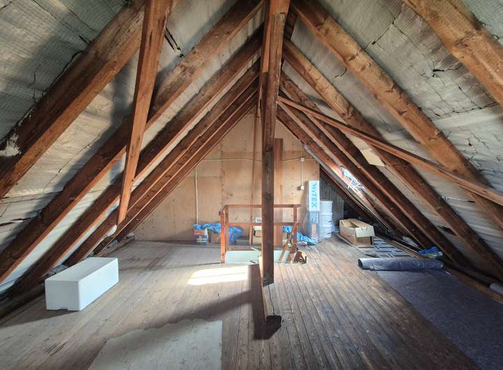 Die Wohnung im Dachgeschoss ist eine Maisonettwohnung mit 3 Zimmern, einem Tageslichtbad und einer Küche mit Einbauküche. Im Flur gibt es fest verbaute Regale im Aufgang zum Maisonettzimmer.