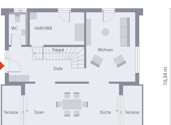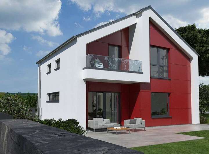 Mehr als nur Standard: Mit diesem Einfamilienhaus erfüllen wir den Wunsch nach modernen, außergewöhnlichen Architekturkonzepten, in denen Komfort und Gemütlichkeit dennoch nicht zu kurz kommen. Dies erreichen wir durch durchdachte Raumlösungen wie dem ausgefallenen Ess- und Küchenbereich, bei dem sich die Küchenzeile entlang der gesamten Wandbreite zieht. An diesen offenen Gemeinschaftsbereich schließt sich das moderne Wohnzimmer an, das zum Verweilen einlädt. Ein Gäste-WC sowie der Hauswirtschaftsraum komplettieren das Raumkonzept des Erdgeschosses. Das Obergeschoss beherbergt wiederum die privaten Rückzugsmöglichkeiten für die ganze Familie. Hier findet sich neben zwei großen und hellen Kinderzimmern, die beide über einen kleinen Balkon verfügen, auch der Schlafbereich der Eltern, der viel Platz für Bett, Schränke und Co. bietet. Ein großes Bad mit Dusche und Badewanne rundet das Design der Etage gekonnt ab und ist über die offene Galerie zu erreichen.