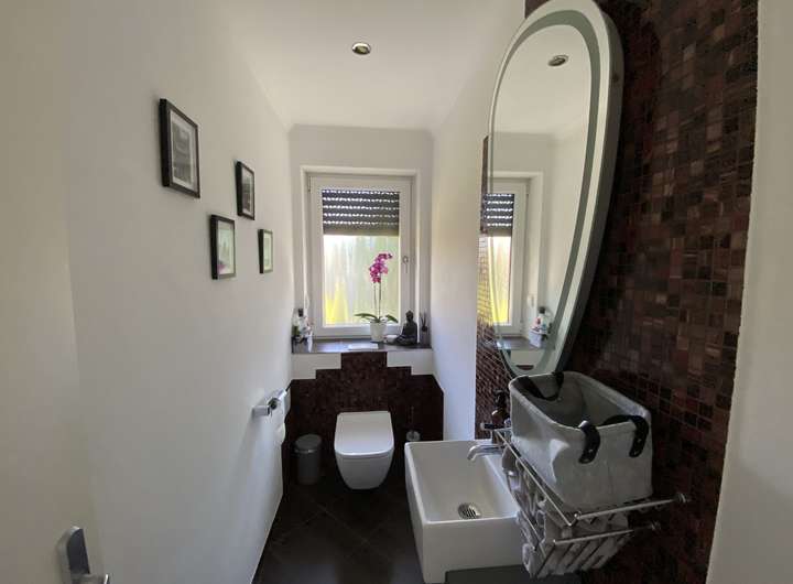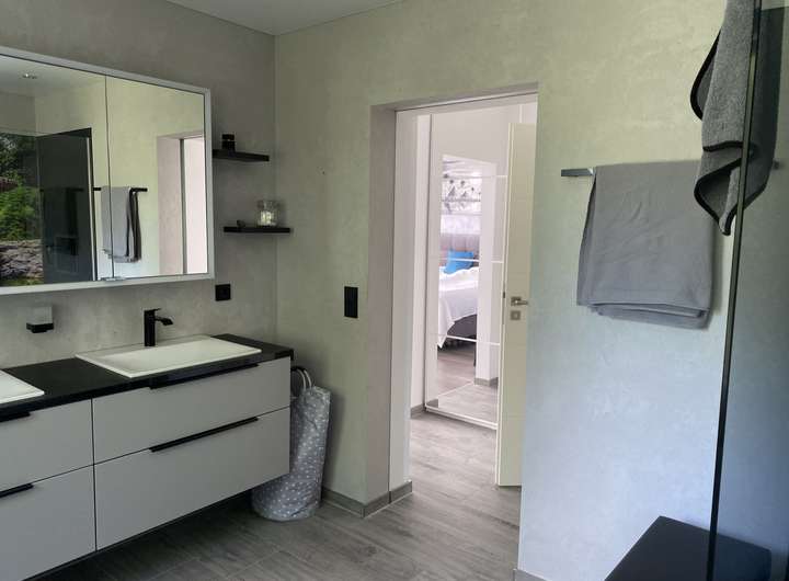 Das Kellergeschoss bietet neben den Technik- und Lagerräumen zusätzlich viel Platz und vielfältige Nutzungsmöglichkeiten für Hobby-, Sport- und Freizeitaktivitäten. Durch große Fensterflächen in einigen Räumen tritt viel Tageslicht ein. Auch ein Badezimmer ist hier vorhanden. Besonders praktisch ist der direkte Zugang vom Keller in den Garten, der das Haus noch flexibler nutzbar macht. Im Technikraum befinden sich die Wärmepumpe aus dem Jahr 2024 und auch der Pufferspeicher, der auch über den wasserführenden Kamin (aus 2023) versorgt werden kann. Ebenso ist hier auch der Batteriespeicher der Photovoltaikanlage installiert.