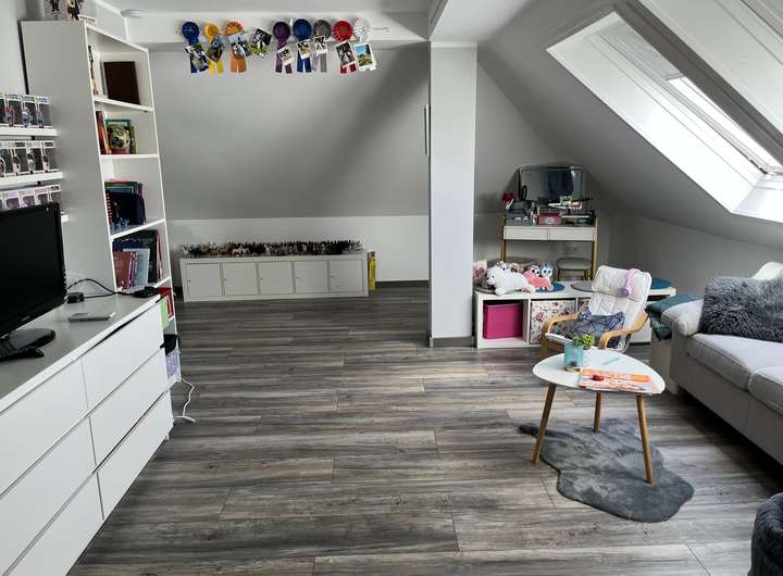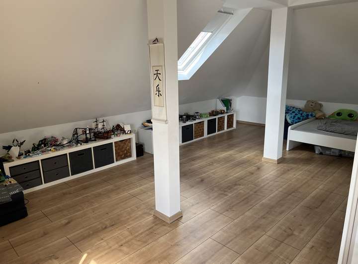 Im Obergeschoss stehen zwei geräumige Schlafzimmer zur Verfügung, die viel Platz zum Spielen, Arbeiten oder Entspannen bieten. Ein Badezimmer mit Dusche ergänzt die Etage. Zudem verfügt eines der Schlafzimmer über eine Loggia, die man in der warmen Jahreszeit genießen kann.