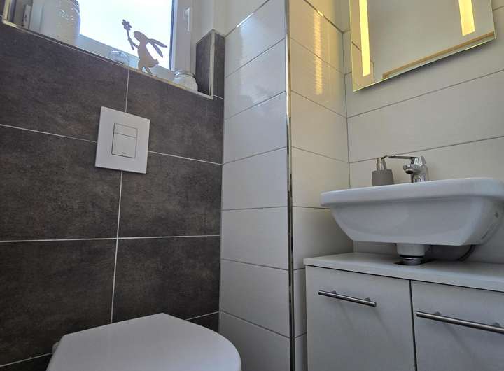 2014: Modernisierung des Badezimmers und der WC-Räume, Einbauküche, Fußboden (Vinyl) und Malerarbeiten, neue Haustür