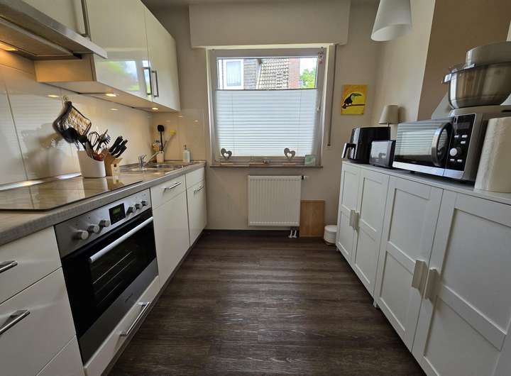 Einbauküche mit E-Herd, Backofen und Kühlschrank mit Gefrierfach