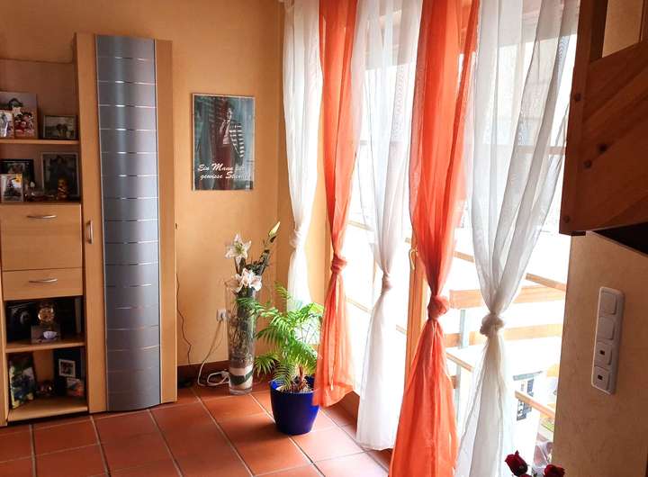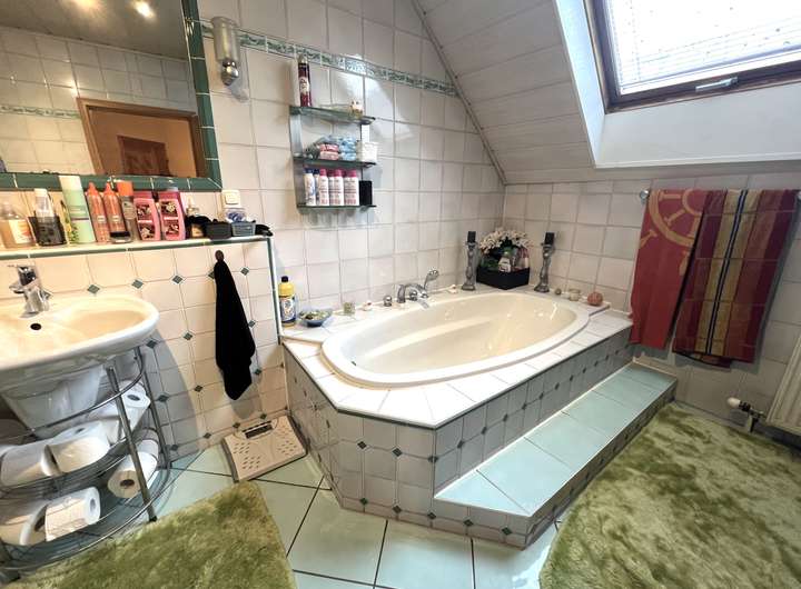 Im Obergeschoss erwartet Sie ein weiterer, gemütlicher Wohnbereich mit Blick in den ruhigen Innenhof. Das großzügige Badezimmer mit Wanne und Dusche bietet hohen Komfort. Ein großes Elternschlafzimmer mit praktischem Einbauschrank, ein Kinderzimmer sowie ein Abstellraum runden diese Etage perfekt ab.