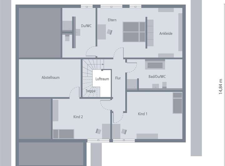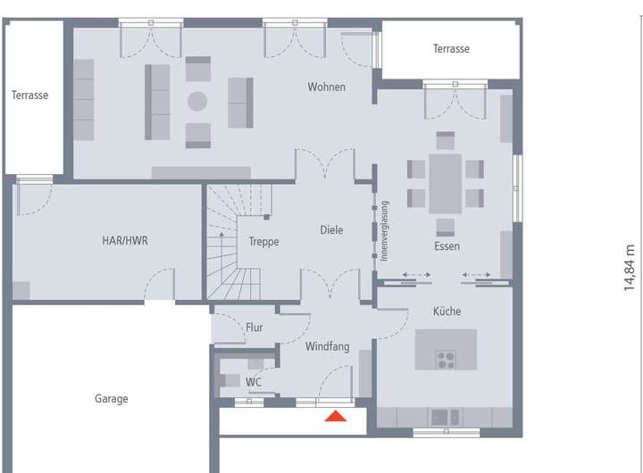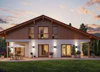Unter dem formschönen Satteldach punktet dieses Einfamilienhaus mit viel Raum zum Wohlfühlen. Im Erdgeschoss bietet der lichtdurchflutete Wohnbereich mit seinen fast 40 m² ausreichend Platz zum Verweilen in behaglicher Atmosphäre und einen direkten Zugang zur Terrasse. In der geschlossenen Küche können sich Kreative ungestört auf die Zubereitung kulinarischer Köstlichkeiten konzentrieren und in gemütlicher Umgebung des Esszimmers genießen. Vom großen Hauswirtschaftsraum lässt sich die Garage mit zwei Stellplätzen unmittelbar erreichen. Direkt am Eingangsbereich befindet sich ein kleines Gäste-WC, anschließend führt die zentralgelegene Treppe hoch ins Dachgeschoss. Geräumige Wohnfläche, separates Bad mit Dusche und WC, angeschlossene Ankleide und Zugang zur Dachterrasse: im Schlafzimmer sind alle Voraussetzungen für individuelles Wohlbefinden vorhanden. Zwei großzügige Kinderzimmer, ein weiteres Bad mit Wanne, Dusche und WC sowie ein Abstellraum runden den Landhauswohnstil der oberen Etage ab.