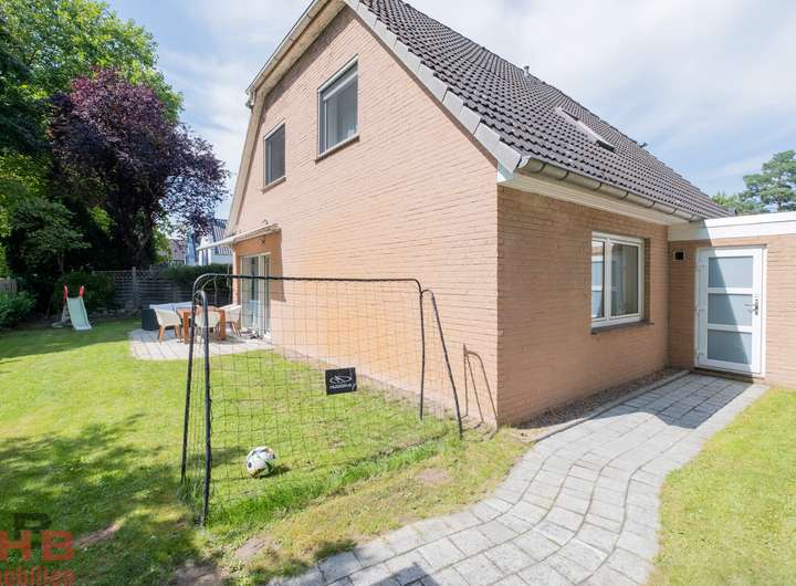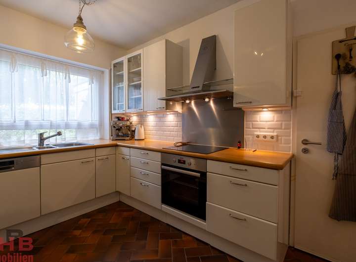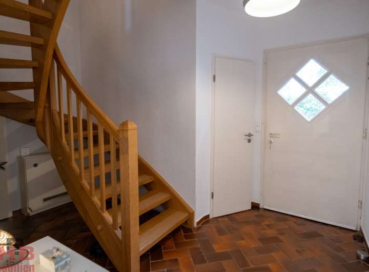 Diese hier angebotene Immobilie wurde im Jahre 1981 in Massivbauweise als Rotklinker Doppelhaus errichtet. Es befindet sich am Ende eines Privatweges (Sackgasse), in eingewachsener Umgebung, weit entfernt von der Straße. Die Doppelhäuser stehen versetzt zueinander, so dass sich lediglich im Eingangsbereich, dem Treppenhaus und GWC Berührungspunkte ergeben (siehe Grundriss). Das Haus befindet sich in einem sehr gepflegten Zustand. Der Eingangsflur verfügt über einen Rotklinkerbodenbelag. Im Uhrzeigersinn gehen vom Flur zunächst die Küche mit EBK (Siematic), kleinem Essplatz und Zugang zum Hauswirtschaftsraum ab. Weiter folgt das sehr großzügige Wohnzimmer mit großen bodentiefen Fensterfronten und einem Fenster im Essbereich. Der Raum ist mit hellem hochwertigem Parkett ausgestattet. Ein gemauerter Kamin verspricht angenehme Stunden (nicht nur) zur kalten Jahreszeit. Vom Wohnzimmer gelangt man auf die ideal nach Süd-Westen ausgerichtete Sonnenterrasse mit angrenzendem kleinen Garten. Abschließend befindet sich selbstverständlich auch ein GWC im Eingangsbereich. Im Obergeschoss, welches sich über eine attraktive Vollholztreppe erschließt, gehen alle Räume von dem zentralen Flur ab. Hier befinden sich 3 ungleich große Schlafzimmer und ein renoviertes Tageslicht Vollbad. Ein Spitzboden bietet ausreichend Staufläche und ersetzt den fehlenden Keller