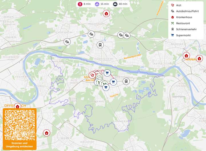 Die Innenstadt von Mühlheim mit ihren zahlreichen Einkaufsmöglichkeiten, Cafés, Restaurants und Dienstleistungsangeboten ist schnell erreichbar. Supermärkte, Bäckereien, Apotheken und Ärzte befinden sich in unmittelbarer Umgebung und sind bequem zu Fuß oder mit dem Fahrrad erreichbar.