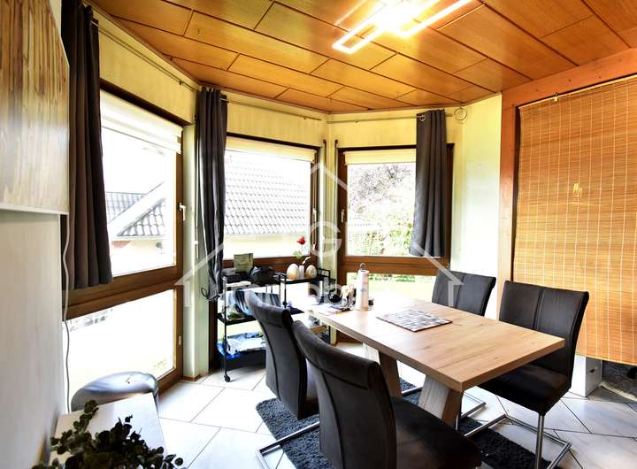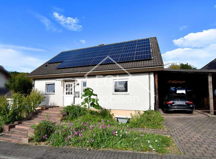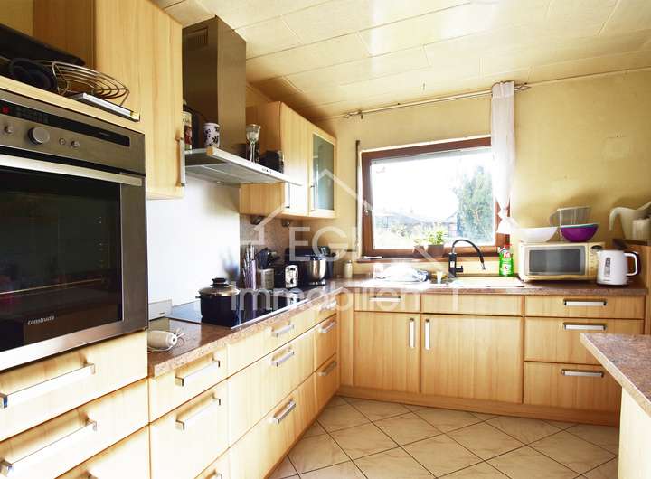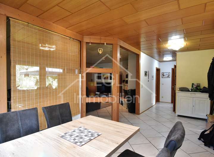 Dieses freistehende Einfamilienhaus mit Einliegerwohnung (auch als Zweifamilienhaus nutzbar) aus dem Jahr 1994 liegt in attraktiver Höhenlage oberhalb des Mittelrheintals in der Ortsgemeinde Auel. Die Immobilie bietet ca. 186 m² Wohnfläche auf drei Ebenen sowie ca. 40 m² Nutzfläche und eignet sich für verschiedene Wohnkonzepte wie Mehrgenerationenwohnen, Teilvermietung oder Wohnen und Arbeiten unter einem Dach. Die Hauptwohnung erstreckt sich über Erd- und Untergeschoss mit rund 132 m² Wohnfläche. Der großzügige Wohn- und Essbereich besticht durch freiliegendes Gebälk, das dem Raum eine besondere Atmosphäre verleiht – eine gelungene Kombination aus offenem Wohngefühl und charmantem Landhausstil. Ein gemütlicher Kachelofen, eine moderne Küche (2010) sowie der direkte Zugang zur großzügigen Terrasse und dem Garten schaffen Wohnqualität mit Wohlfühlfaktor. Zwei Schlafzimmer und ein Tageslichtbad ergänzen diese Ebene. Im Untergeschoss befinden sich zwei weitere Schlafzimmer, ein Bad sowie Hauswirtschafts- und Abstellräume. Die Einliegerwohnung im Dachgeschoss (ca. 54 m²) ist separat zugänglich und umfasst ein Wohn-/Esszimmer mit Balkon, ein Schlafzimmer, Küche und Bad – ideal für die Vermietung oder als Rückzugsbereich. Der großzügige, eingewachsene Garten bietet viel Privatsphäre, eine große Terrasse, Gartenlauben, Obststräucher, einen kleinen Teich sowie Rasenflächen.