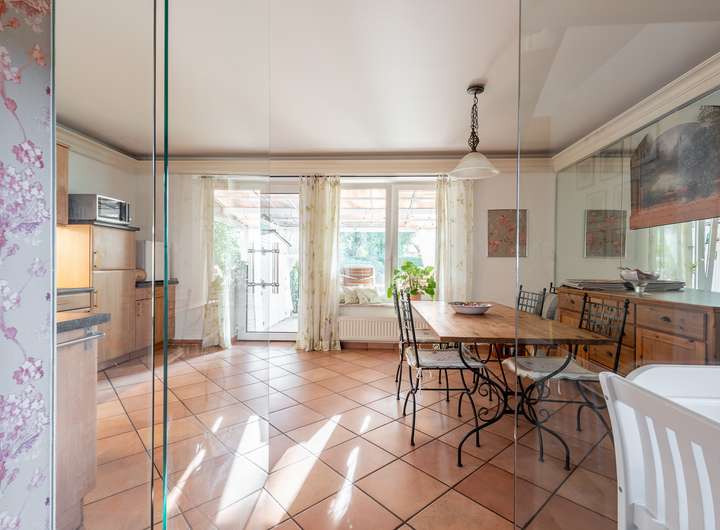 Im Erdgeschoss erwartet Sie der lichtdurchflutete, großzügige Wohn- und Essbereich mit direktem Zugang zur Terrasse sowie das Gäste-WC. Die Fenster im Wohnbereich bieten einen unverbauten Blick in den nicht einsehbaren, liebevoll angelegten Garten mit altem Baumbestand.