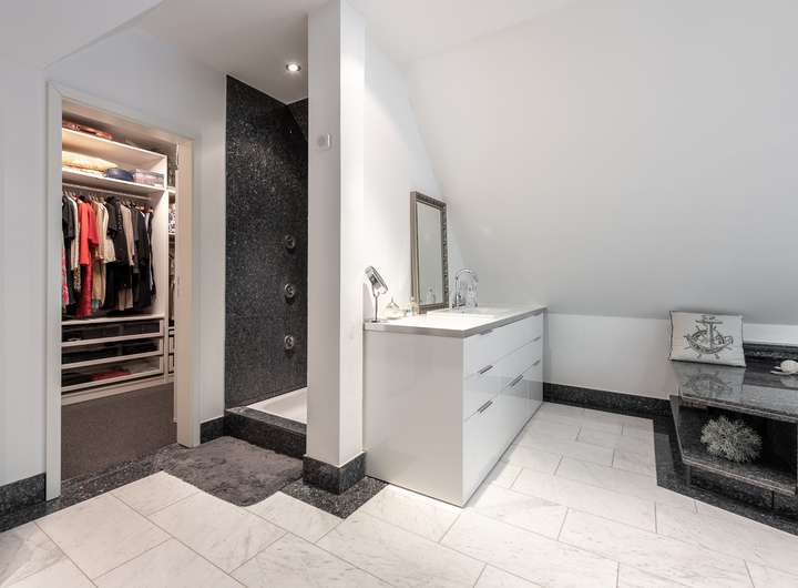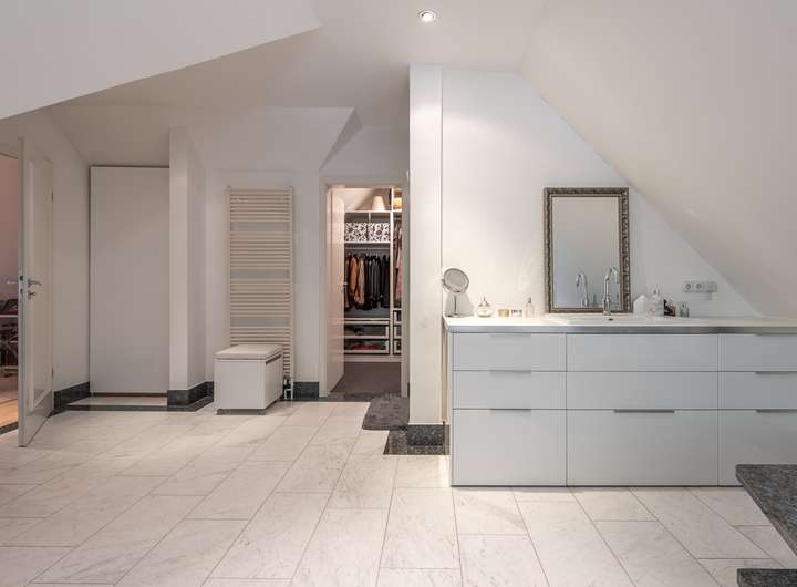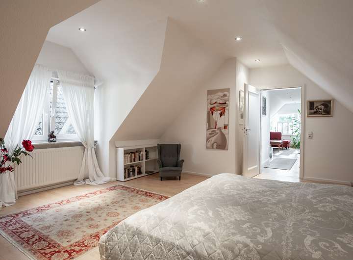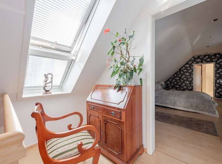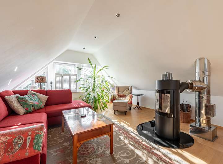 Das offene Raumkonzept setzt sich im Obergeschoss fort. Hier finden Sie einen weiteren Wohnbereich, das großzügige Schlafzimmer sowie das angrenzende Wellness-Badezimmer, das modernen Wohnkomfort mit Gemütlichkeit verbindet.