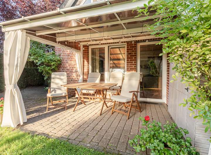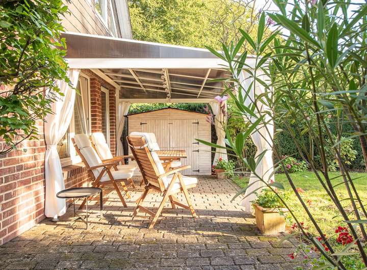 Die nach Westen ausgerichtete Terrasse lädt zum Entspannen in der Abendsonne ein und bietet einen beeindruckenden Blick ins Grüne.