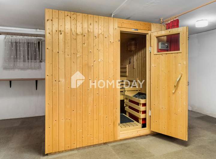 Ein besonderes Highlight ist der großzügige Vollkeller, der das Raumangebot des Hauses deutlich erweitert. Hier befindet sich ein großer Raum, der sich hervorragend als Partykeller oder Hobbyraum eignet. Zwei weitere Kellerräume bieten praktische Abstellflächen, wobei einer davon zusätzlich mit einer Sauna ausgestattet ist und so eine private Wellnessoase im eigenen Zuhause ermöglicht. Zudem verfügt der Keller über eine zusätzliche Küche mit Pantry sowie eine separate Dusche und ein separates WC – ideal für Gäste oder als praktische Erweiterung des Haushalts.