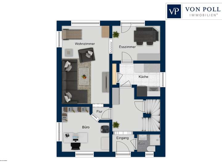 Im Erdgeschoss bietet sich ein offenes Wohnkonzept an – ein großzügiger Wohn-Ess-Bereich, der heutigen Vorstellungen einer modernen Raumaufteilung entspricht. Ein weiterer Raum eignet sich beispielsweise als Büro.