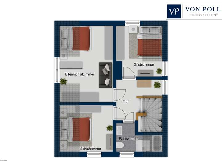 Im Obergeschoss stehen drei weitere, gut proportionierte Zimmer zur individuellen Nutzung bereit. Je nach Bedarf lassen sich hier Schlaf-, Kinder- oder Gästezimmer realisieren.