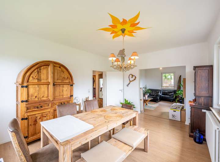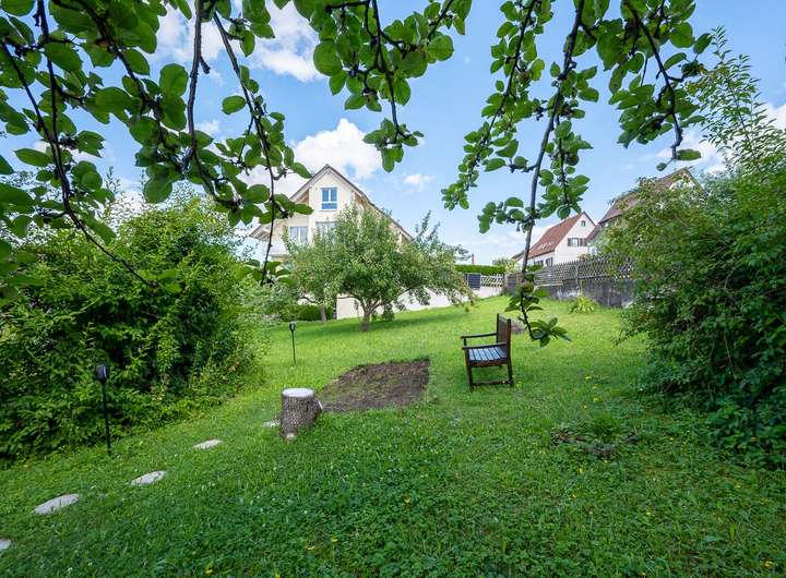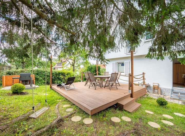 Erholung pur heißt es auf der großzügigen Holzterrasse mit separatem Grillbereich, die nach einem harten Arbeitstag zum Entspannen einlädt. Dort können Sie mit Ihren Liebsten speisen oder bei einem Gläschen Wein den Abend ausklingen lassen. Im traumhaft schönen Garten, der das Grundstück nahezu komplett umschließt, können Sie Ihren grünen Daumen unter Beweis stellen. Dieser lässt für jung und alt keine Wünsche offen.