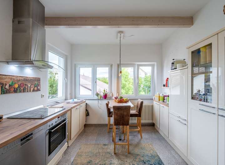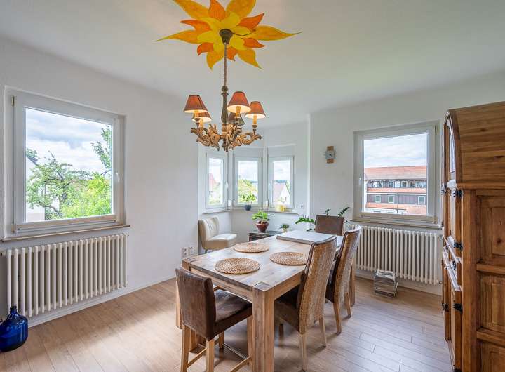 Besonders hervorzuheben im Erdgeschoss sind der großzügige und repräsentative Wohn-/Essbereich mit Eckerker und den hohen Decken, die lichtdurchflutete Wohnküche, dessen dort befindliche Einbauküche von den Vormietern übernommen werden kann und ein geräumiges Zimmer für die individuelle Nutzung mit Zugang zum schönen Garten.