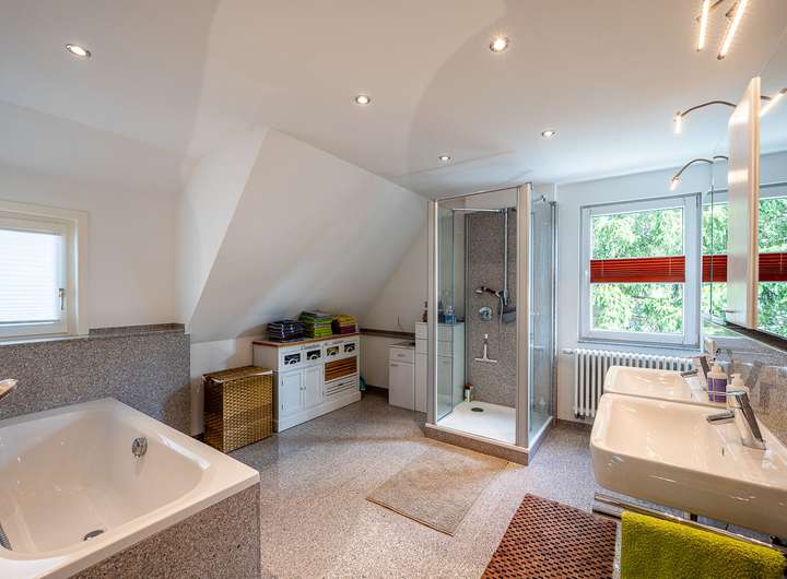 Das großzügige Familien-Tageslichtbad im Dachgeschoss besticht durch seinen Wohlfühlfaktor. Neben einer Dusche und einem Doppelwaschbecken, verleiht die Badewanne einen Hauch von Wellness. Außerdem befinden sich auf dieser Wohnebene drei vollwertige Zimmer, die unterschiedlichste Nutzungsmöglichkeiten bieten. Ihr Team von LANGE