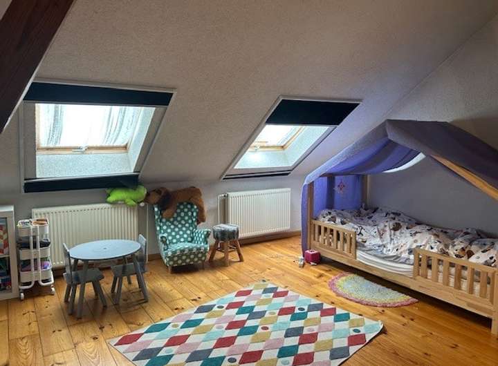 Die zweite Wohnung bietet ein großes, gemütliches Wohnzimmer mit Kaminofen und Zugang zum Balkon, ein Schlafzimmer, ein großes Kinderzimmer, eine Einbauküche, ein modernes Badezimmer, sowie einen Hauswirtschaftsraum.