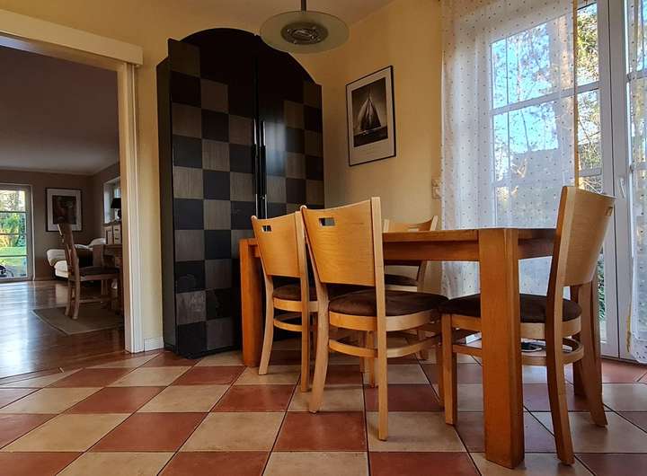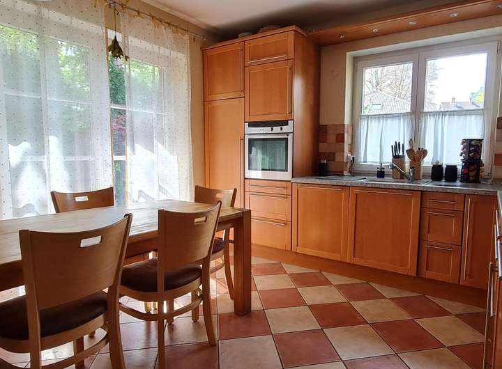 Küche: Die große Küche bietet ausreichend Platz für gemeinsame Kochabende, verfügt über einen direkten Zugang zum Garten und ist über eine Schiebetür mit dem offenen Wohnbereich verbunden. Ein separater Hauswirtschaftsraum bietet weiteren Stauraum für Lebensmittel und Haushaltsgeräte.