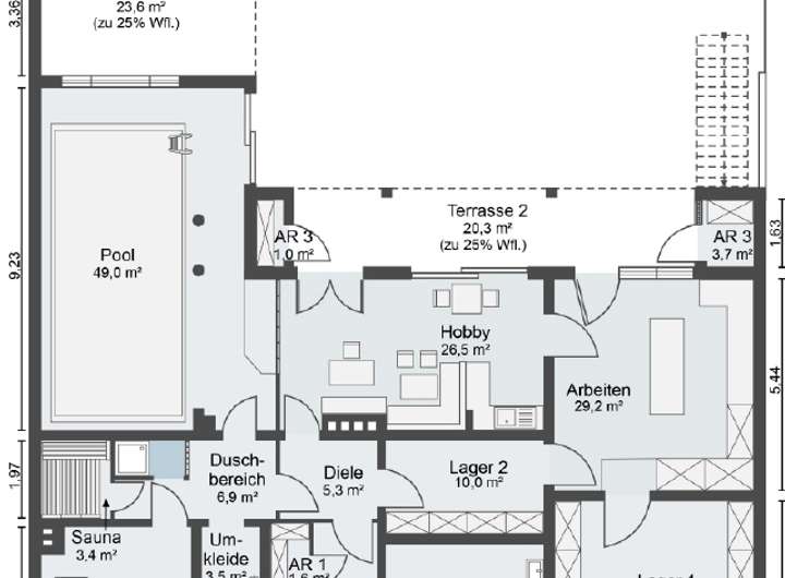 - sonstige Ausstattung: Sauna, Pool (3,56 x 7,46 m), Einbauschränke