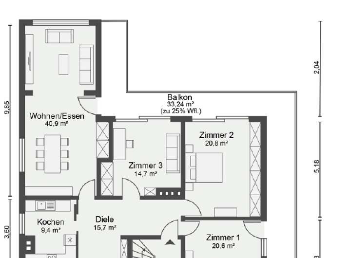 - Balkone: EG: 7 m²; OG: 33 m²; DG: 7 m²; SW-Ausrichtung; größtenteils überdacht und uneinsehbar