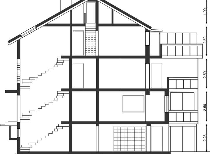 - Raumhöhe: UG: 2,25 m; EG/OG/DG: 2,5 m; SB: 1,99 m