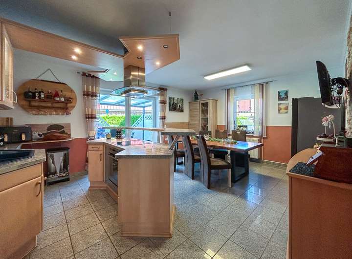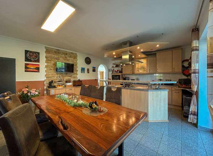 Hinter der Tür entfaltet sich ein Lebensraum voller Wärme und Offenheit. Das Erdgeschoss zeigt sich hell und freundlich, die Fliesenböden verleihen den Räumen Großzügigkeit, und die Küche bildet das Herzstück des Hauses. 2025 frisch gestrichen, strahlt sie in neuem Glanz. Hier entstehen die Geschichten des Alltags – das gemeinsame Frühstück am großen Tisch, der Duft von frisch gekochtem Kaffee, das Lachen bei Gesprächen, die länger dauern, als gedacht. Die Fußbodenerwärmung schenkt in der kühlen Jahreszeit behagliche Wärme und macht deutlich: Komfort steht hier im Mittelpunkt.