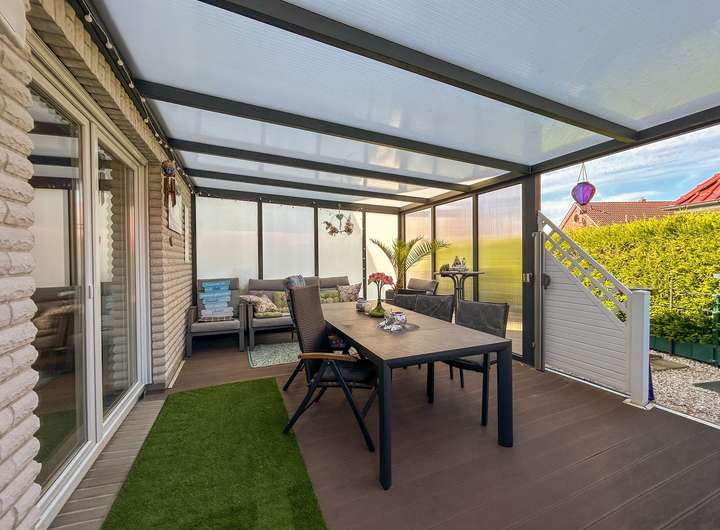 Das Wohnzimmer öffnet sich mit großen Fenstern zum Garten. Sonnenlicht fällt hinein und der Blick hinaus zeigt einen Außenbereich, der wie ein zweites Wohnzimmer wirkt. Der Garten ist mit Liebe gestaltet, und die überdachte Terrasse, die 2014 hinzugefügt wurde, ist ein Platz für jede Jahreszeit. Ob ein Sommerabend bei Kerzenschein, ein Glas Wein im Herbstregen oder die ersten Sonnenstrahlen im Frühjahr – dieser Ort erzählt Geschichten von Momenten, die bleiben.