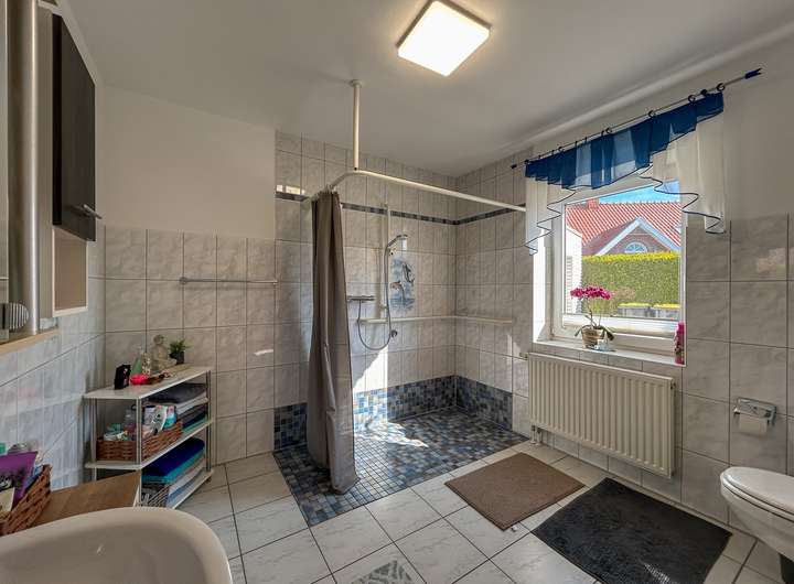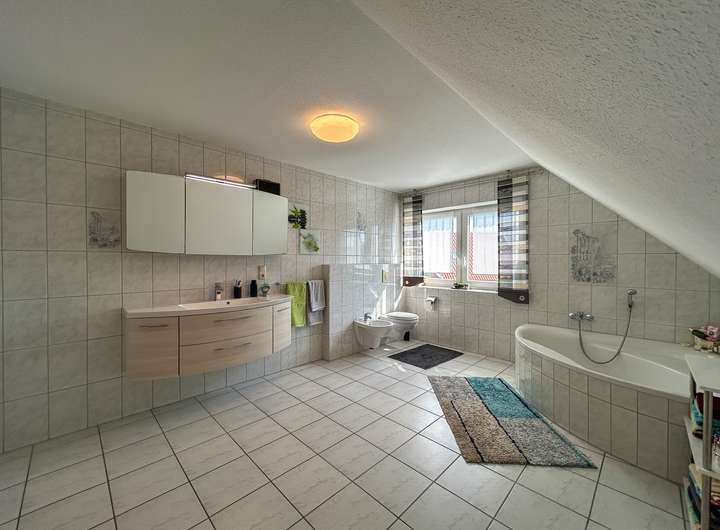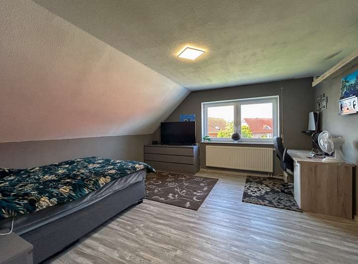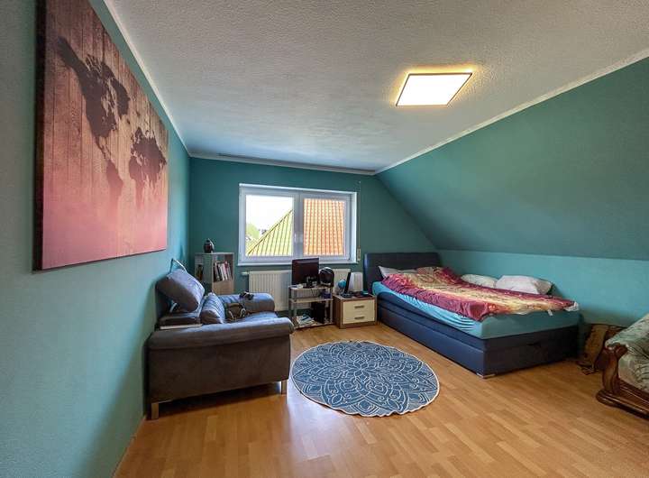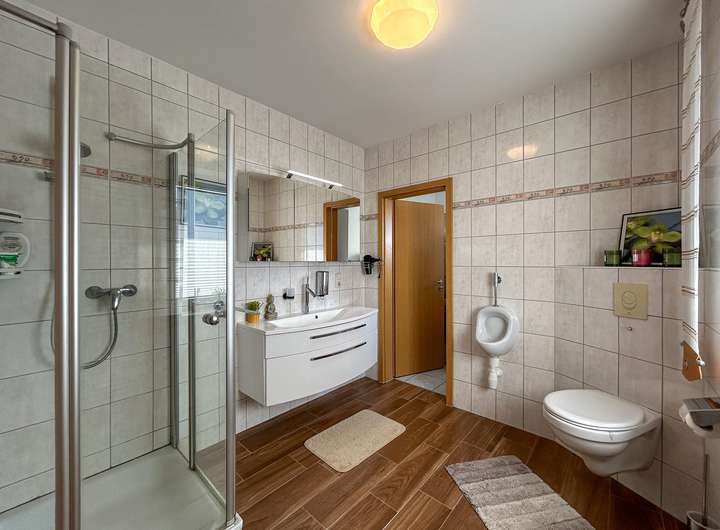 Im Obergeschoss setzt sich die wohnliche Atmosphäre fort. Die Kinderzimmer sind hell, freundlich und voller Möglichkeiten. Sie bieten Raum für Spiel, Rückzug oder kreative Ideen – Räume, die mit den Menschen wachsen, die hier leben. Das große Badezimmer mit klaren Fliesen und Fußbodenerwärmung ist nicht nur praktisch, sondern auch ein Ort der Ruhe und Entspannung.