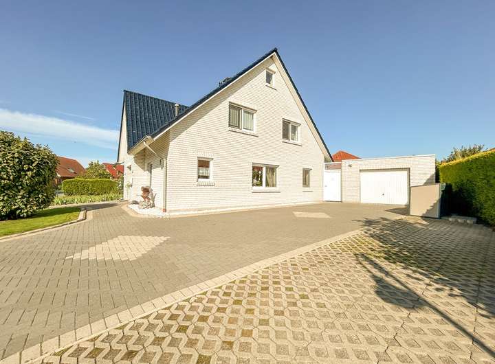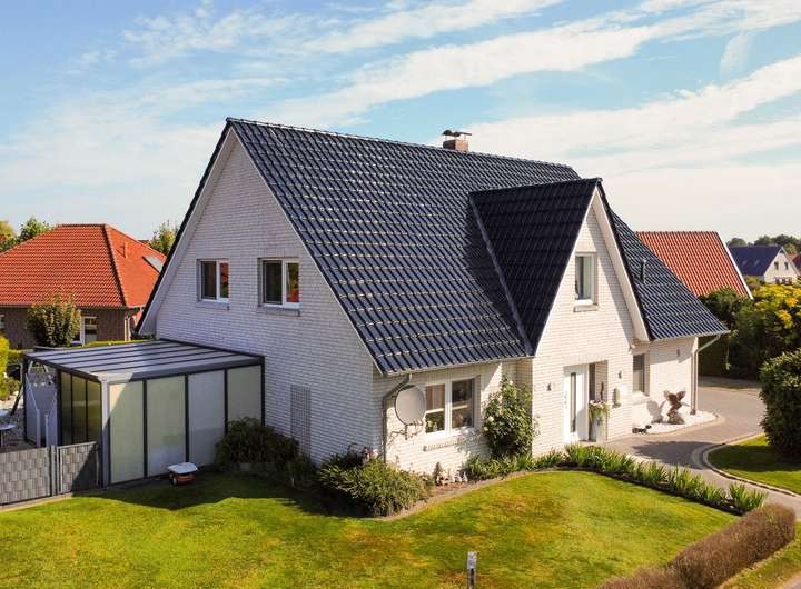 Wenn die ruhige Sackgasse erreicht ist, öffnet sich der Blick auf ein Zuhause, das schon beim ersten Eindruck Geborgenheit ausstrahlt. Die helle Klinkerfassade schimmert im Sonnenlicht, das dunkle Dach verleiht dem Haus Charakter, und die großzügige Auffahrt lädt ein, hier anzukommen. Alles wirkt einladend, aufgeräumt und so, als würde das Haus schon darauf warten, seine neuen Bewohner willkommen zu heißen.