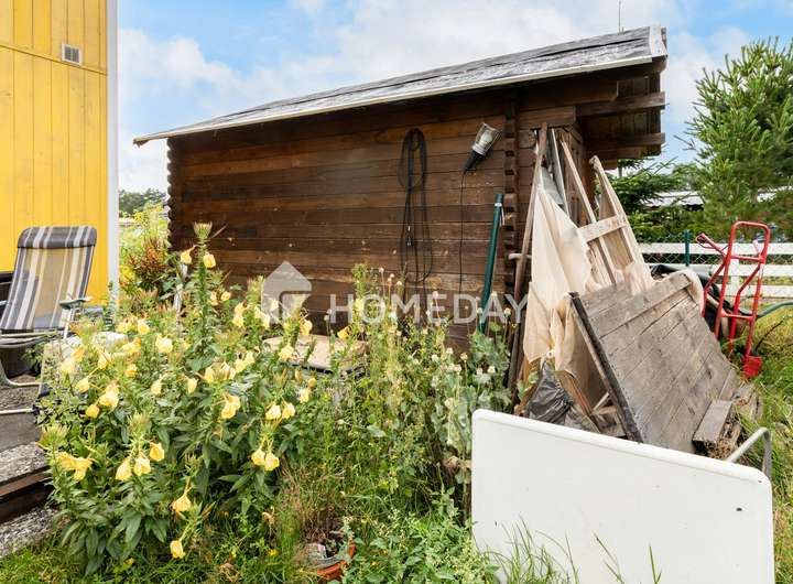 Zwei Terrassen erweitern den Wohnraum ins Freie: eine direkt am Wohnzimmer, die zweite vom Flur aus erreichbar. Der naturnahe Außenbereich mit Blumenbeeten und Sitzgelegenheiten lädt zum Entspannen ein. Ein Holzschuppen bietet Stauraum, ein Außenstellplatz ist vorhanden.