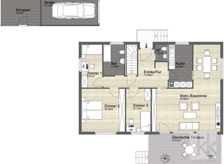 Im rechten Teil des Hauses befindet sich der private Wohnbereich mit zwei Kinderzimmern, die sich flexibel auch als Homeoffice oder Hobbyräume nutzen lassen, sowie dem Schlafzimmer. Das Badezimmer auf dieser Ebene ist mit Badewanne inkl. Duschoption ausgestattet.