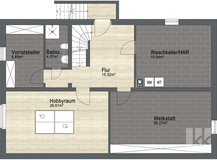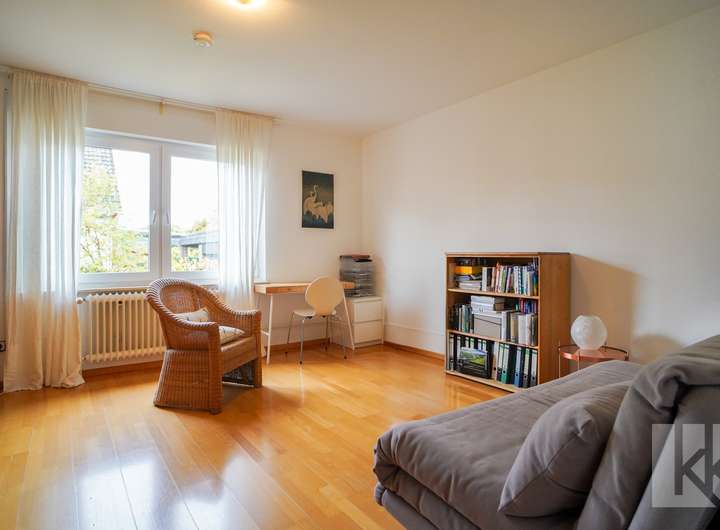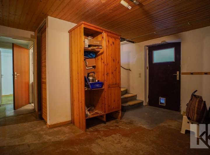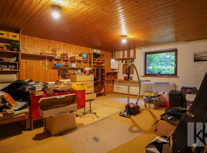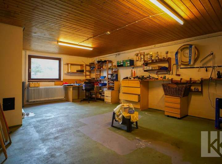 Der Bungalow ist vollunterkellert und bietet neben klassischen Nutzräumen auch wohnlich ausgebaute Bereiche: ein Büro oder Gästezimmer mit großem Fenster und Heizkörper sowie ein weiteres Badezimmer mit Dusche schaffen zusätzliche Möglichkeiten zur individuellen Nutzung. Ergänzt wird das Untergeschoss durch die Waschküche, den Heizungsraum mit einer modernen Gasbrennwerttherme aus dem Jahr 2022 sowie eine große Werkstatt mit einer Deckenhöhe von 2,20 Metern.