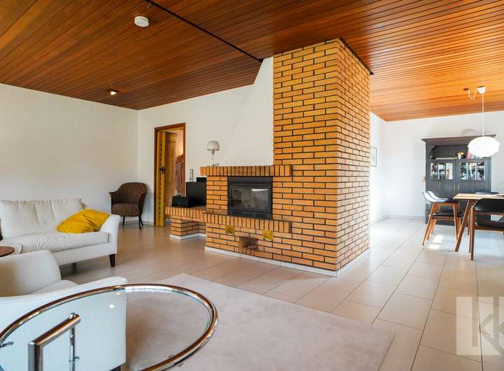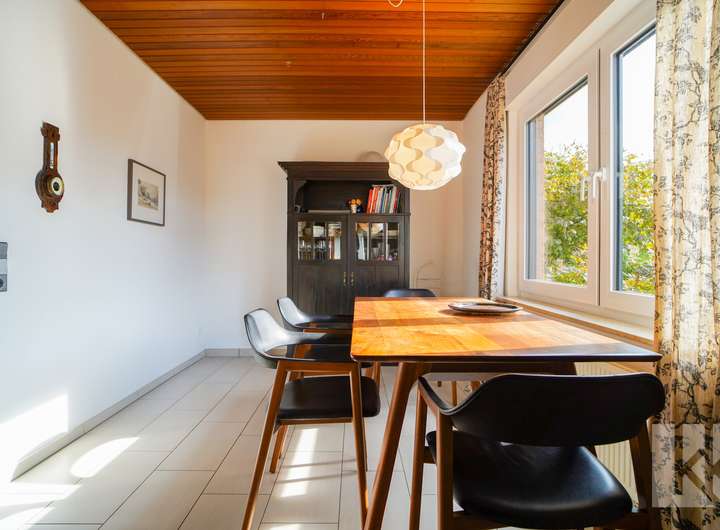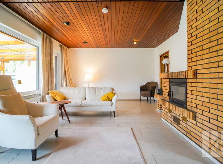 Über eine kleine Treppe gelangt man in den Eingangsbereich mit Windfang. Direkt links befindet sich das Gäste-WC, bevor sich der Weg weiter in die Küche öffnet. Diese ist mit einer hochwertigen Einbauküche ausgestattet, die im Kaufpreis enthalten ist und mit einem Gasherd Hobbyköchinnen und -köche gleichermaßen begeistert. Der angrenzende Essbereich geht fließend in das großzügige Wohnzimmer über – das Herzstück des Hauses. Hier sorgt ein festgemauerter Kamin für wohlige Wärme und eine behagliche Atmosphäre. Der Blick durch die große Fensterfront führt hinaus auf die überdachte Terrasse und in den weitläufigen Garten – ein idyllischer Rückzugsort, der zu jeder Jahreszeit begeistert.