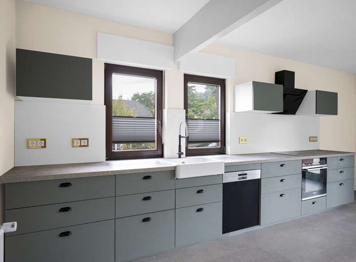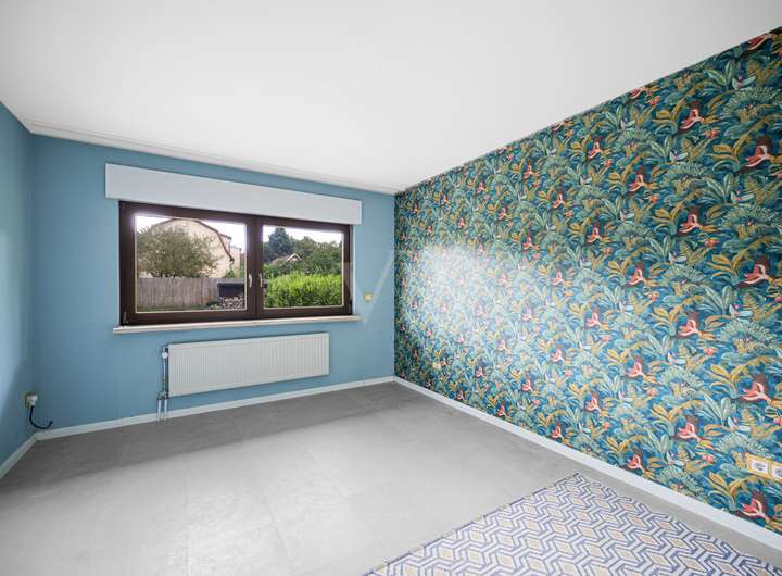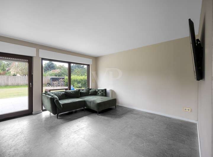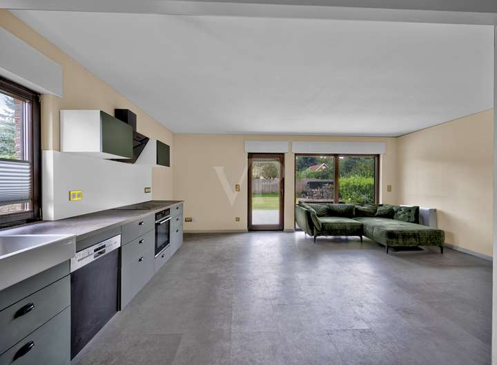 Der offene Wohn- und Essbereich mit angrenzender Küche überzeugt durch Helligkeit, Großzügigkeit und den traumhaften Blick auf Terrasse und Garten. Die moderne Einbauküche kann im Haus verbleiben. Von hier gelangt man direkt in ein weiteres Zimmer, das sich ideal als Gäste- oder Kinderzimmer eignet.