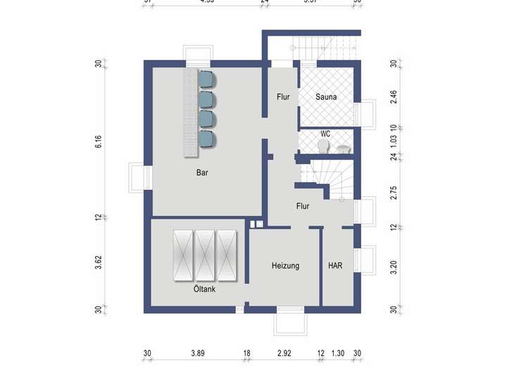 Im Keller steht eine Sauna zur Entspannung bereit. Komfortabel ist, dass eine zusätzliche Duschmöglichkeit sowie eine separate Toilette eingebaut wurden. Ein weiteres Highlight ist die große Bar mit Tresen. Die Ölheizung und die Innentanks sind in separaten Räumen untergebracht. Des Weiteren gibt es einen Vorratsraum und einen direkten Zugang mit Außentreppe in den Garten.