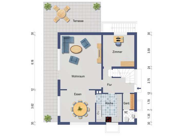 Im Erdgeschoss befinden sich das offen gestaltete helle Wohn- und Esszimmer mit Zugang zur Terrasse, sowie die Küche mit direktem Durchgang zum Esszimmer. Vom Flurbereich gelangen Sie zu einem weiteren hellen Zimmer, zur Garderobe und dem Gäste-WC, sowie in das Obergeschoss und in den Keller.