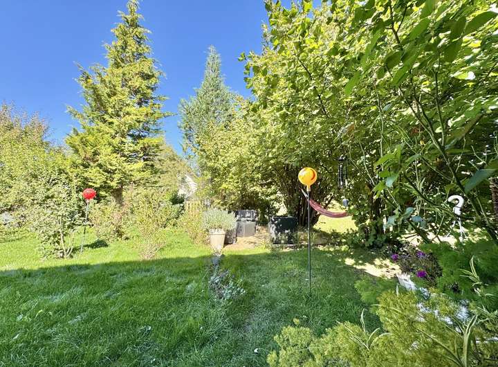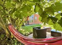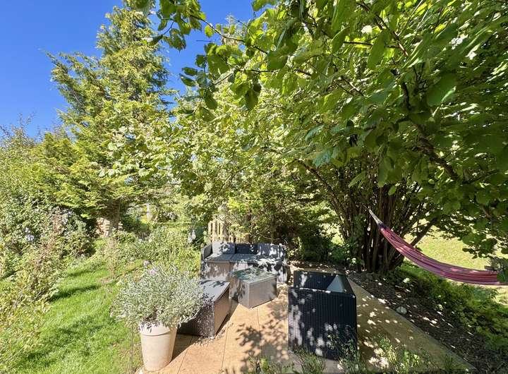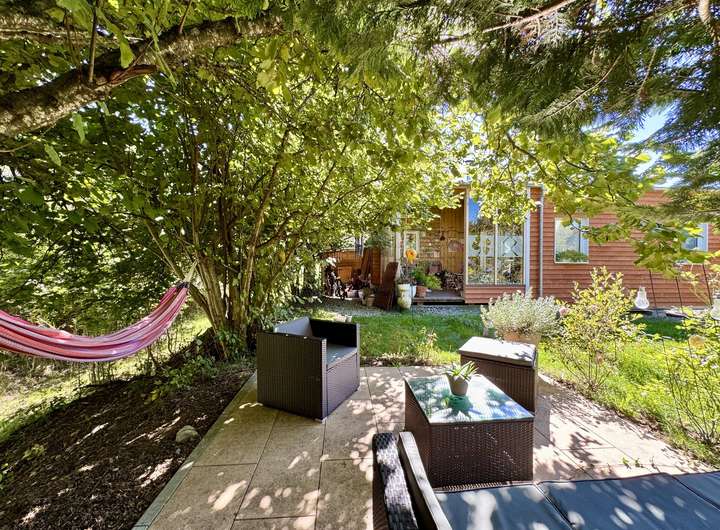 Der Wintergarten und die beiden Terrassen – eine im Eingangsbereich, eine ruhig zum Garten hin – schaffen herrliche Rückzugsorte. Im Garten lädt eine weitere Sitzgelegenheit unter Haselnusssträuchern zum Entspannen ein.