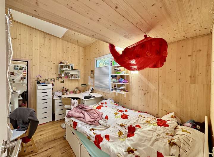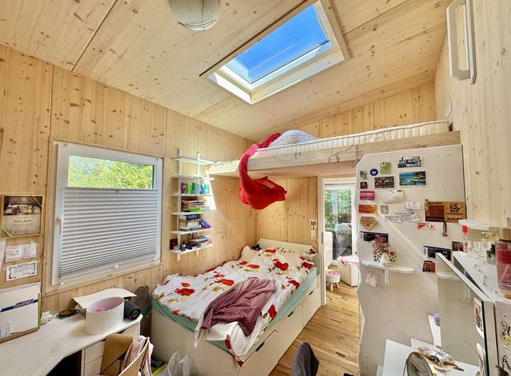 Über eine Treppe gelangt man zur Schlafebene im Dachbereich, der oberhalb von Küche und Bad liegt. Ein zweites Schlafzimmer befindet sich im seitlichen Anbau und bietet sogar einen separaten Eingang – ideal als Gästezimmer oder Büro.