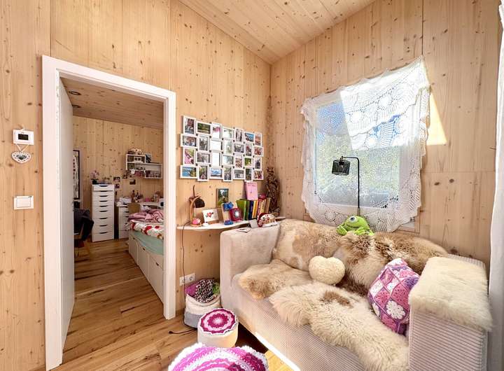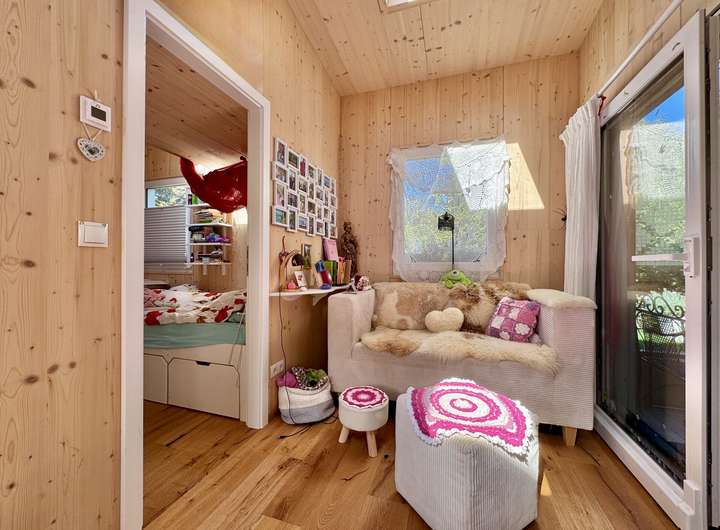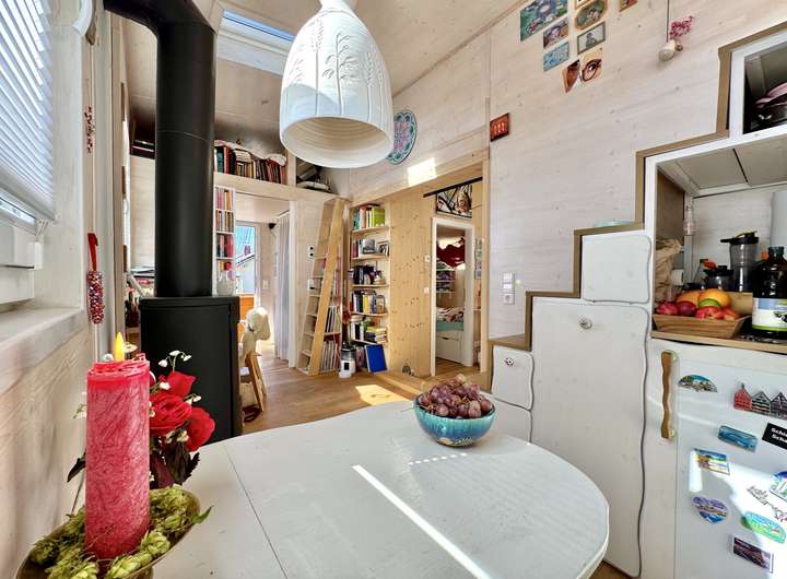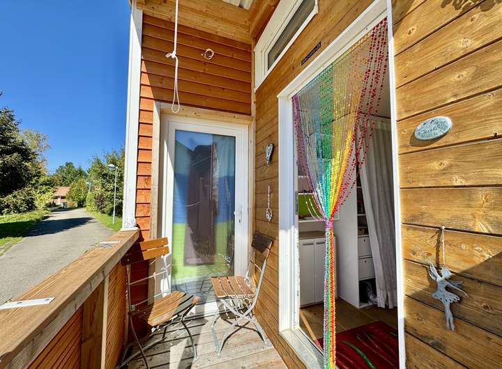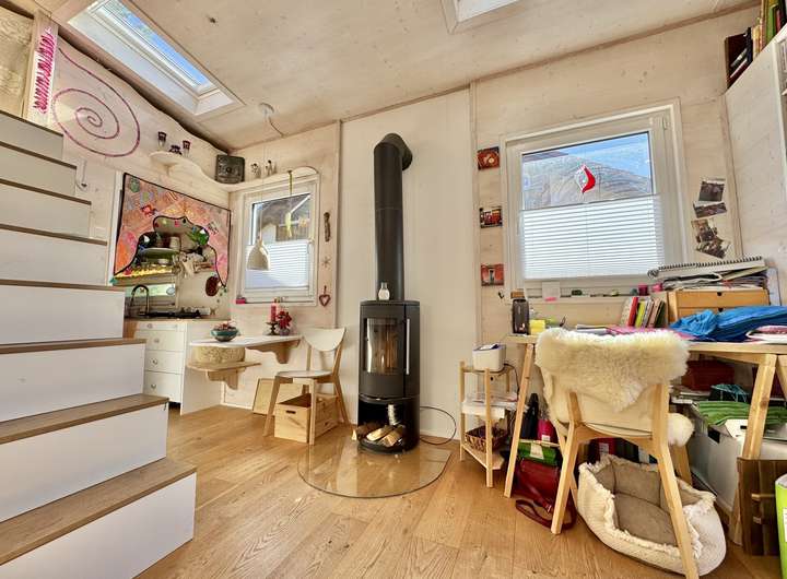 Das Haus liegt in einem ruhigen Wohngebiet ohne weitere Tiny Houses – ideal für alle, die Ruhe und Natur im Allgäu schätzen. Hochwertige Materialien wie der Eichen-Dielenboden und große Dachfenster sorgen für eine helle, freundliche Atmosphäre.