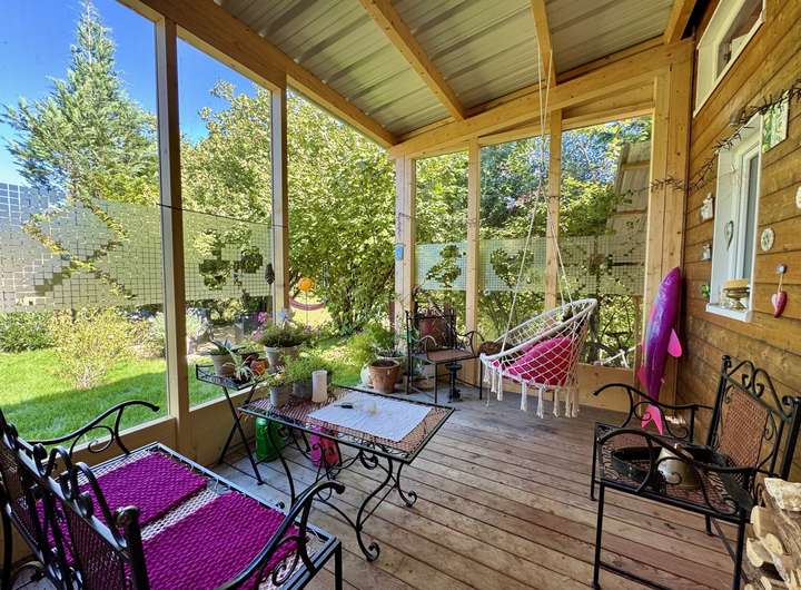 Die verglaste und überdachte Terrasse lädt zum Entspannen bei jedem Wetter ein. Zusätzlich steht eine weitere Terrasse im Außenbereich zur Verfügung.