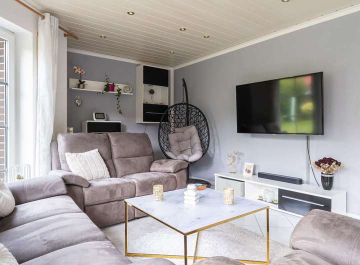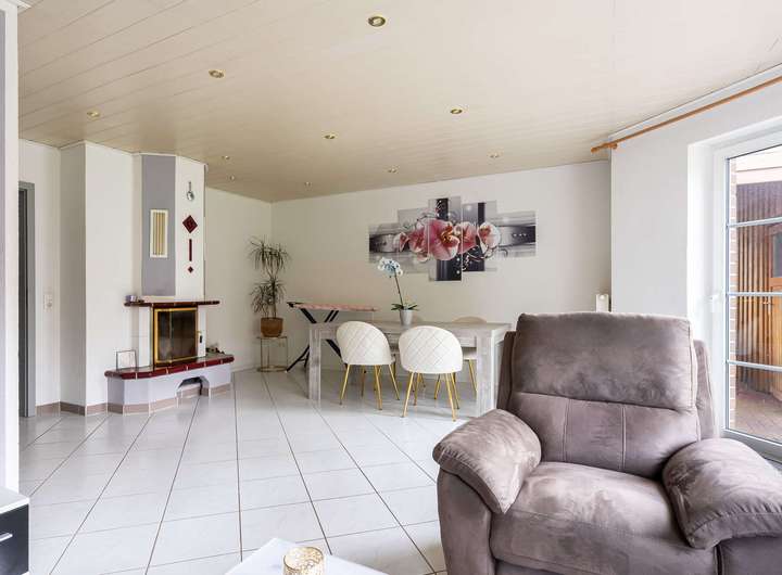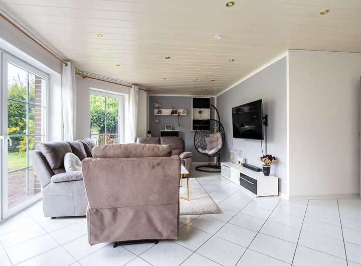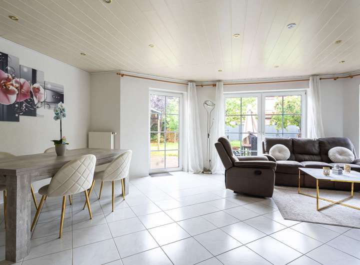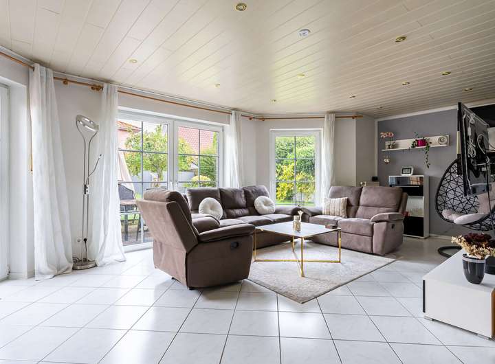 Das Herzstück des Hauses bildet das großzügige, lichtdurchflutete Wohnzimmer. Bodentiefe Fensterelemente sorgen nicht nur für einen herrlichen Lichteinfall, sondern bieten auch einen wunderbaren Blick in den gepflegten Garten.